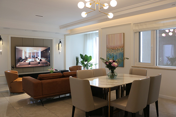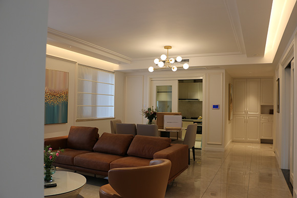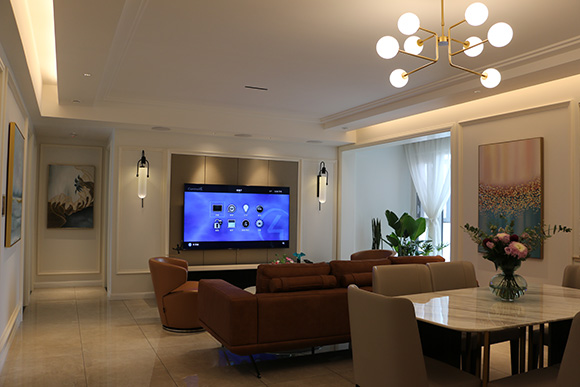 需要離開展廳時,一鍵離家模式,家用電器、空調、電動窗簾、電視、房間里所有燈光都會關閉,安防系統也會啟動,如有外人闖入室內,也會馬上啟動報警系統,這時會接到防區報警電話,可以通過遠程監控觀看家里此時畫面,也可通知物業管理員上門查看情況。
