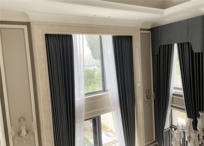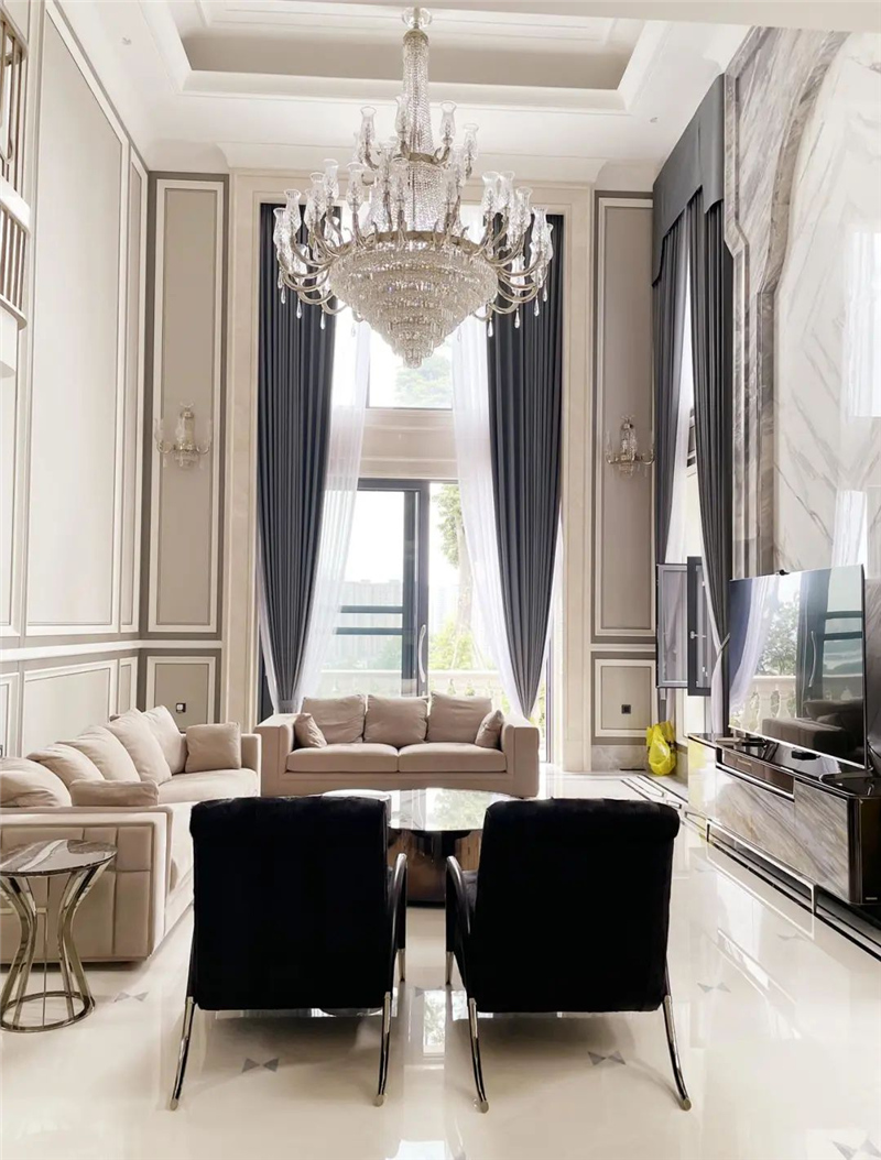 業主家里客廳、餐廳、臥室的窗簾全部是智能控制的,項目共使用了25套雙軌,內外兩層,紗簾與布簾都可以分開操作,設計師設置成日落后臥室窗簾自動關閉,早上按“晨起”時,臥室布簾輕輕打開,在任何地方,家中的所有窗簾都可以通過墻面開關、觸摸屏或是手機來控制。