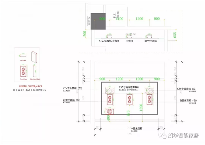 整個(gè)影視廳是嚴(yán)格按照7.2.4杜比全景聲標(biāo)準(zhǔn)進(jìn)行設(shè)計(jì)的,對(duì)音箱設(shè)備擺位有著標(biāo)準(zhǔn),主音箱、側(cè)環(huán)繞、后環(huán)繞、天花環(huán)繞揚(yáng)聲器的位置,夾角的角度,人觀看距離,以及幕布觀看的夾角等。