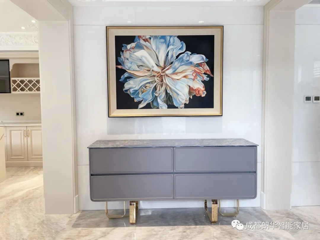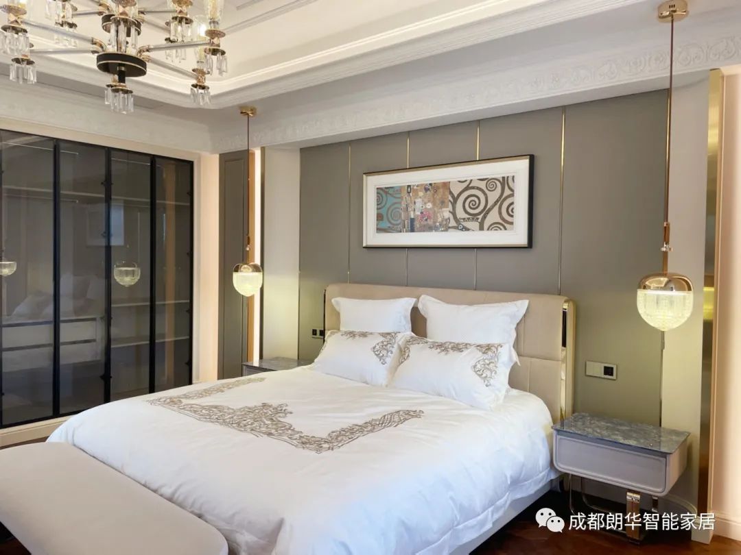 業主家里客廳、餐廳、主臥室的窗簾全部是智能控制的,設計師設置成日落后兩個臥室窗簾自動關閉,早上按“晨起”時,臥室布簾輕輕打開,在任何地方,家中的所有窗簾都可以通過墻面開關、觸摸屏或是手機來控制。