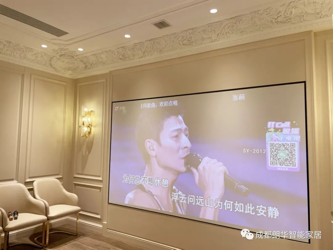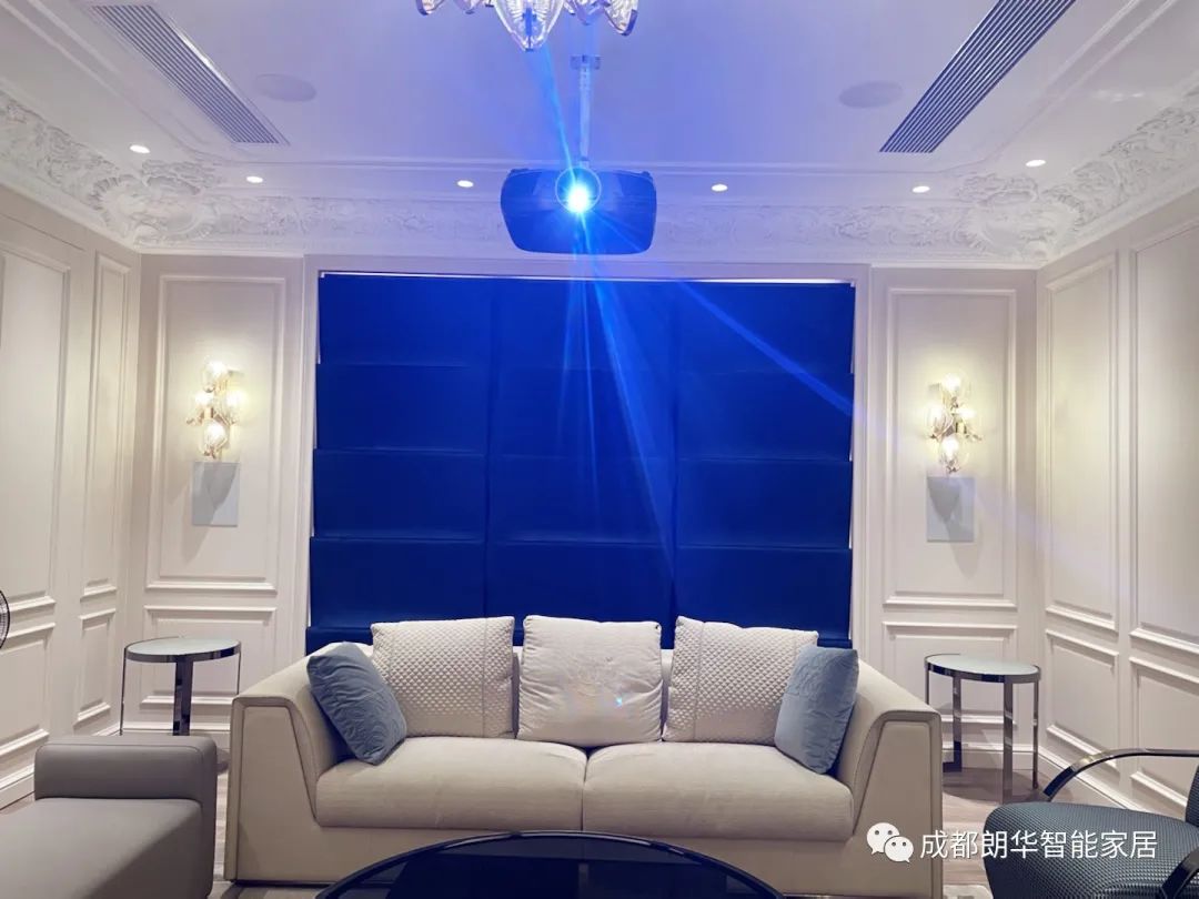 進入影院時,會先亮起一只燈,坐下拿起遙控器后燈光會自動調至明亮,一鍵開啟觀影模式,投影儀開啟,幕布打開至觀影界面,開始播放影片后,燈光又會自動調暗至適合看電影的亮度。Triad音箱隱藏安裝讓整個影院看著整潔漂亮,嵌墻音箱定制面罩無縫隱藏于墻面裝飾中,如果不走近看完全不知其中還隱藏著一對音箱。家庭影院在地下室區域,觀影時間如果門口有人到訪,可視對講可以即時接入門口畫面,不用起身就可以通話或者遠程開門。